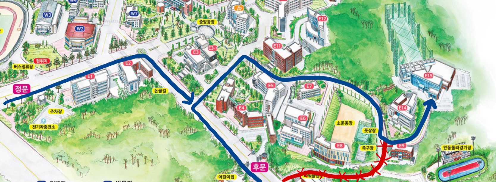 ▶후문 이용 시: 인문학관을 지나 우회전 → 사범대 고시원(우측) 경유 → 음악관(좌측) 경유 → 좌회전 후 진입
